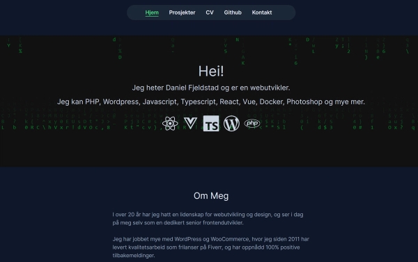 Matrix-inspirert portefølje er utviklet med Next.js og Typescript. Animasjoner er implementert via Framer motion. Design med Tailwind CSS. Form med React Hook Form. Data hentes fra Sanity.